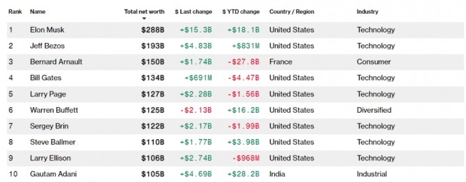 아다니 회장 다음으로 전년 동기 대비 자산이 많이 늘어난 부호는 머스크 CEO와 워런 버핏 버크셔해서웨이 회장뿐으로 머스크는 181억달러(약 22조원), 버핏은 162억달러(약 19조6000억원)씩 각각 늘었다.