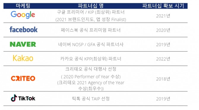 회사의 핵심경쟁력은 크게 ▲독자적인 데이터 분석 기반 마케팅 솔루션 ▲마케팅 서비스 생태계 구축을 통한 고정 고객사 확보 ▲대형 빅테크 매체사와의 파트너십을 들 수 있다.