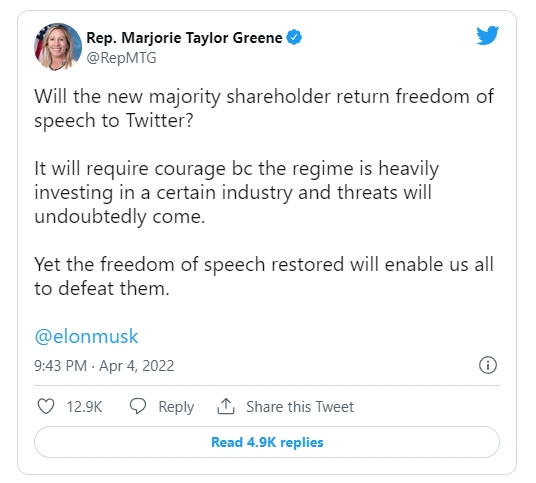 미국 공화당 소속의 극우 정치인으로 유명하고 트럼프가 트위터에서 퇴출당한 뒤에 트위터에서 그의 명맥을 이어가고 있는 초선 연방하원의원인 마저리 테일러 그린은 일찌감치 4일 올린 트윗에서 “트위터에서 사라진 표현의 자유를 새 경영진이 회복시켜야 한다”며 트럼프 대통령의 복권을 머스크에게 요청했다.