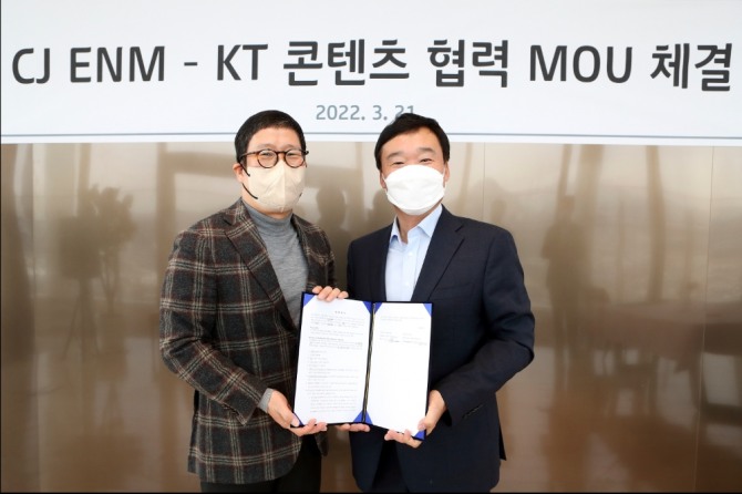 지난달 21일 CJ ENM과 KT가 콘텐츠 사업 협력을 위한 양해각서(MOU)를 체결했다. 체결식에 참석한 강호성 CJ ENM 대표(왼쪽), KT 트랜스포메이션 부문장 윤경림 사장(오른쪽). 사진=CJ ENM