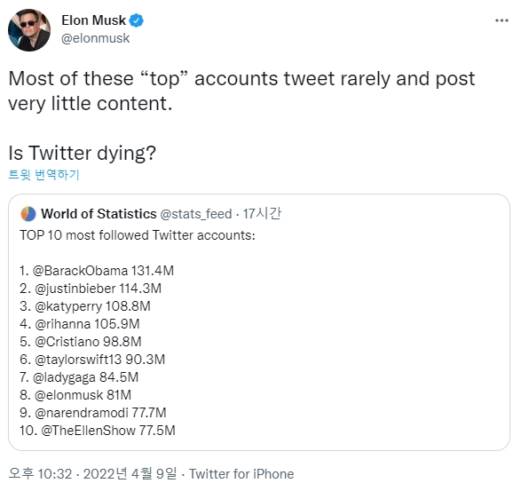 머스크가 공유한 명단은 월드오브스태티스틱스라는 집계기관에서 전세계에서 가장 팔로워를 많이 둔 트위터 사용자의 순위를 매긴 것으로 1위는 버락 오바마 전 미국 대통령(1억3140만명), 2위는 캐나다의 유명가수 저스틴 비버(1억1430만명), 8위는 머스크 이사(8100만명) 등으로 나와 있다.