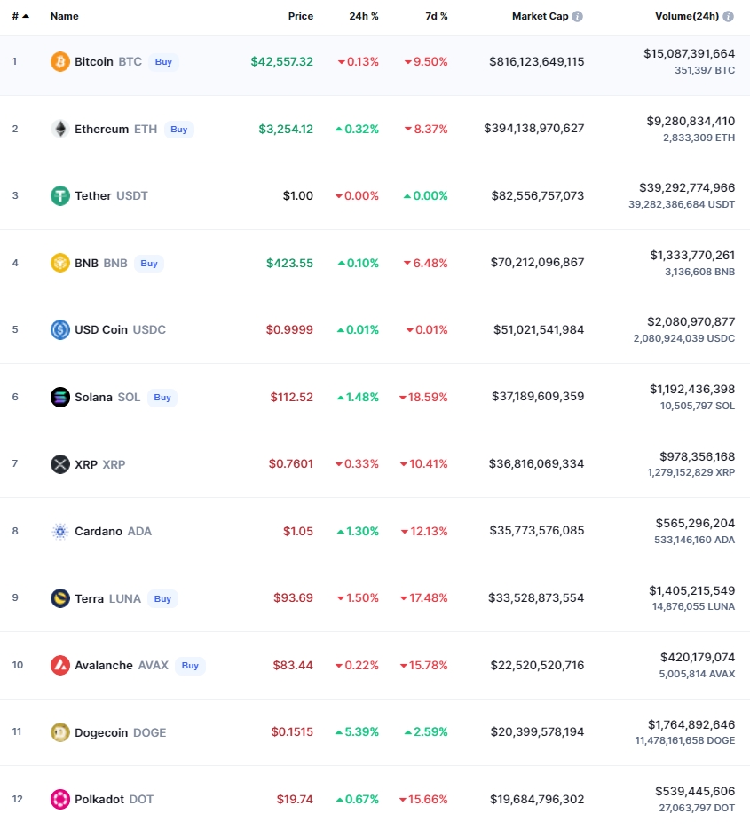 테라(LUNA)는 1.50% 내려가 93.69달러가 됐다. 시가총액은 335억달러로 9위를 유지하고 있다. 업비트에서는 테라의 루나 코인 원화 거래가 지원되지 않는다.