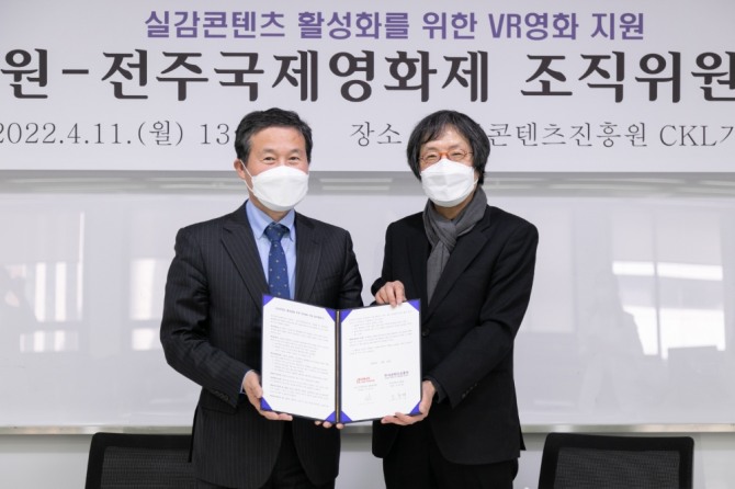 이미지 확대보기이번 업무협약 체결을 위해 11일 이준동 전주국제영화제 집행위원장과 조현래 한국콘텐츠진흥원장을 포함해 주요 관계자 7명이 자리했다. 이들은 협약에 앞서 VR영화 제작 및 국·내외 해외 진출 활성화를 논의했다. 이준동 집행위원장은 "우수한 VR영화 콘텐츠를 발굴하고 지원하며 전주국제영화제를 통해 상영해 한국의 VR영화가 해외로도 진출할 수 있도록 최선을 다하겠다"라고 전했다.