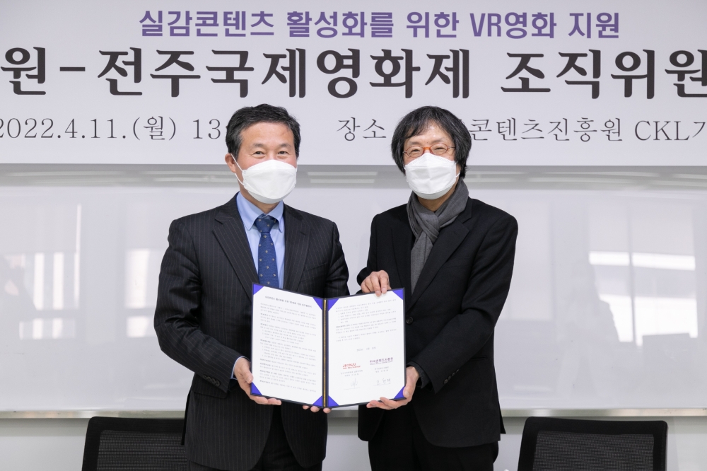 전주국제영화제와 한국콘텐츠진흥원이 '실감콘텐츠 활성화를 위한 VR영화 지원 업무협약'을 체결했다.