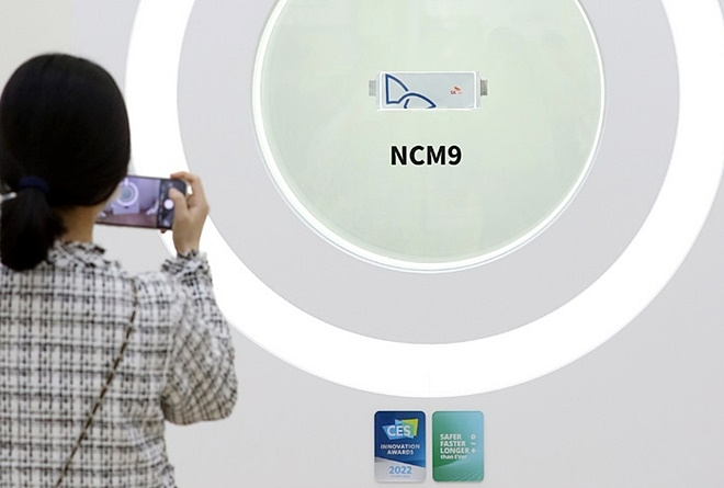 한 관람객이 지난 3월 17일 서울 강남구 코엑스A홀에서 열린 인터배터리 2022에서 SK온 홍보관에 전시된 하이니켈 배터리 NCM9을 살펴보고 있다. 사진=뉴시스이미지 확대보기