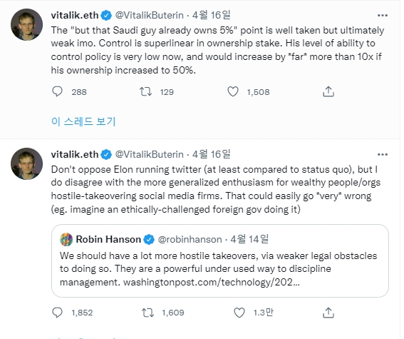 최신 트윗에 따르면 억만장자 프로그래머인 부테린은 '그들이 매우 심각한 결과를 초래할 수 있다고 지적했다. 그는 윤리적으로 문제가 있는 외국 정부가 잠재적으로 그러한 조치를 취할 수 있다는 점을 배제하지 않았다. 동시에 부테린은 머스크가 트위터를 인수하는 것에 대해 지금 그대로 두는 것에 반대하지 않는다'고 말했다.