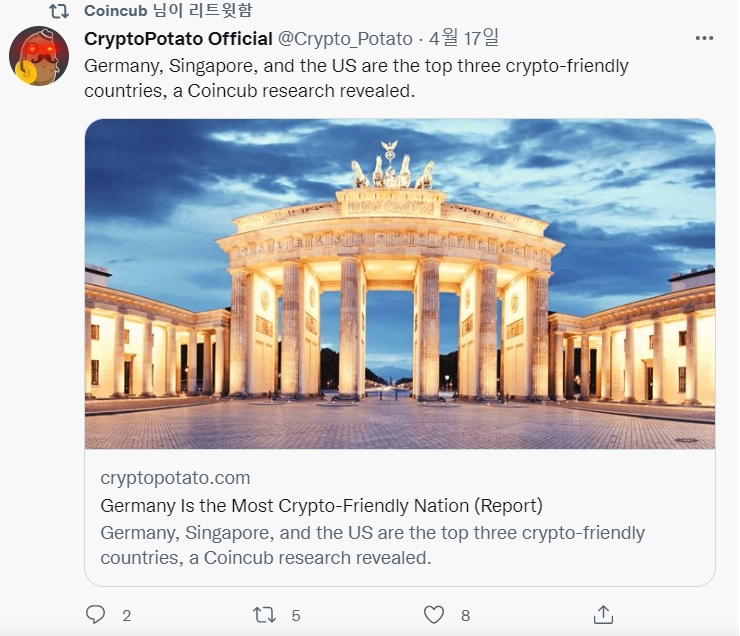 코인커브는 상위 디지털 자산 친화적인 국가의 순위가 지난 몇 달 동안 변경 되었음을 언급했다. 이 회사는 "독일의 암호화폐 수용과 암호화폐 투자 허용에 대한 획기적인 결정으로 2022년 1분기에 1위를 차지했다"라고 말했다.