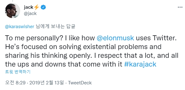 잭 도시 트위터 창업자가 지난 2019년 2월 13일(현지시간) 일론 머스크를 높이 평가하는 내용으로 올린 트윗. 사진=트위터이미지 확대보기