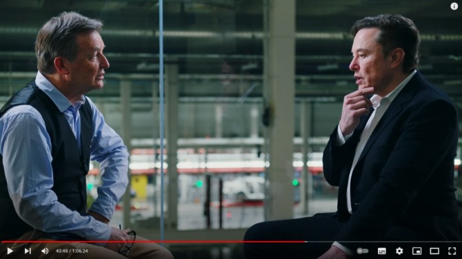 일론 머스크 스페이스X CEO(오른쪽)가 지난 6일(현지시간) 미국 텍사스주 오스틴 소재 테슬라 기가팩토리5에서 크리스 앤더슨 TED 대표와 인터뷰를 갖고 있다. 사진=TED