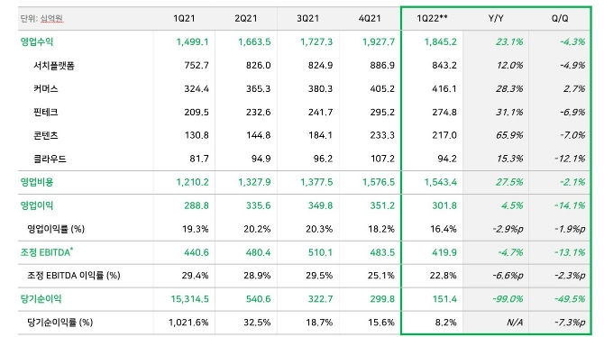 사업 부문별 매출은 서치플랫폼 8432억 원, 커머스 4161억 원, 핀테크 2748억 원, 콘텐츠 2170억 원, 클라우드 942억 원이다.
