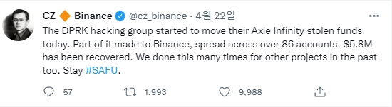 암호화폐 거래소 바이낸스가 지난 3월 해킹당한 6억 달러 상당 암호화폐 중에서 일부 금액을 회수했다고 지난 22일 밝혔다. 사진=트위터
