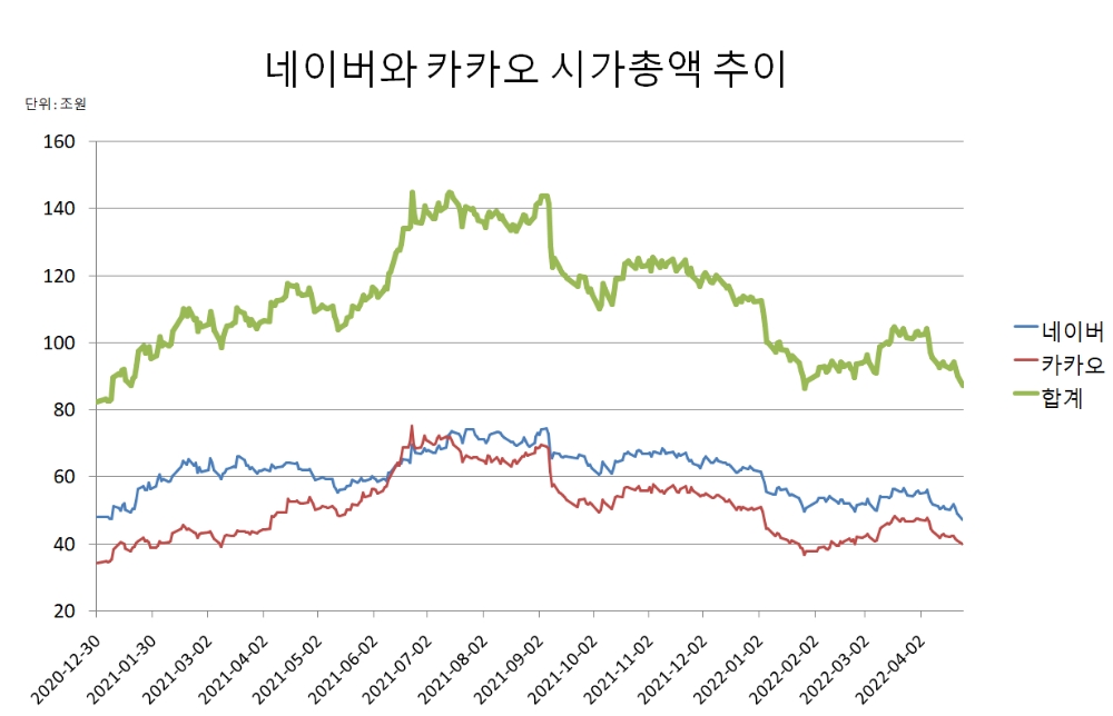 26일 한국거래소에 따르면 지난 25일 기준 네이버 시가총액은 47조3281억원, 카카오 시가총액은 40조304억원으로 이들 두 종목의 합산 시가총액은 87조3586억원을 기록했다.