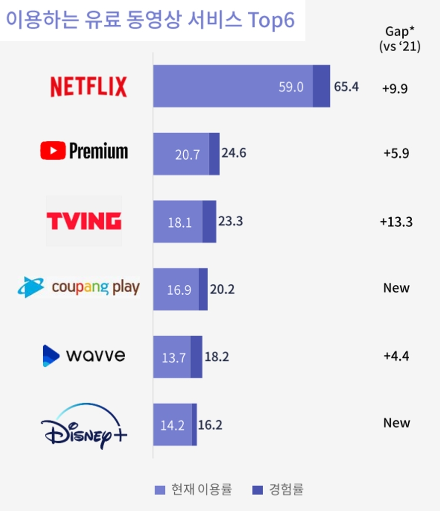 채널별로는 유료 동영상 이용자의 약 60%가 넷플릭스를 이용했고 유튜브 프리미엄이 뒤를 이었다. 주 시청 동영상 종류는 크리에이터 콘텐츠가 가장 많았고 TV관련 콘텐츠와 오리지널 시리즈가 뒤를 이었다.