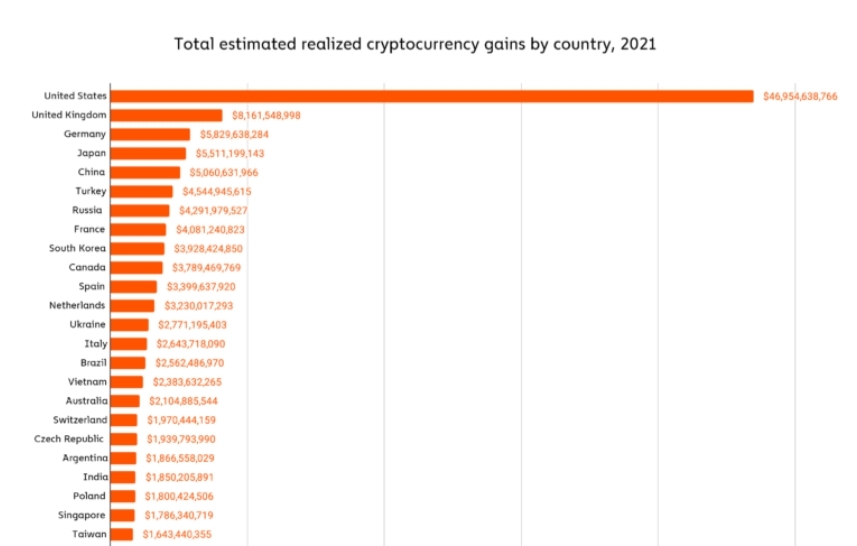 세계 각국 중에서 미국이 약 470억 달러(약 58조 원)에 달하는 암호화폐 실현 수익으로 1위를 차지했고, 영국, 독일, 일본, 중국, 터키, 러시아, 프랑스, 한국, 캐나다, 스페인이 그 뒤를 이었다. 특히 9위에 오른 한국은 39억2800만 달러(약 4조 9000억 원)의 수익을 실현했다.
