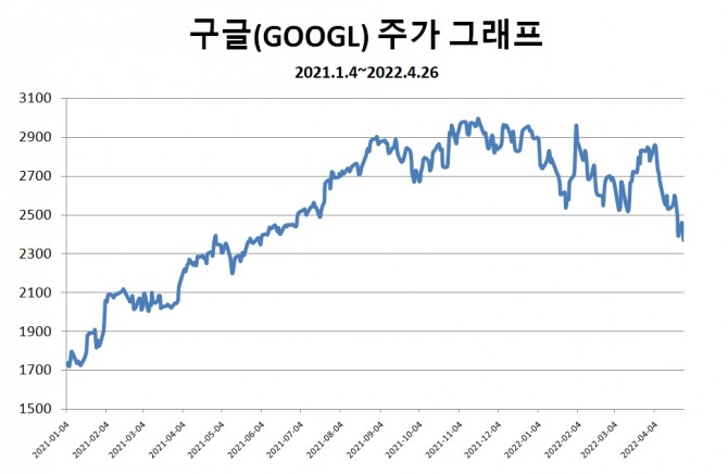 이미지 확대보기26일(현지시각) 구글 주가는 3.59% 하락한 2373.0 달러로 마감했고, 이어진 시간외 거래에서 약 3% 내외의 추가 하락세를 이어갔다.