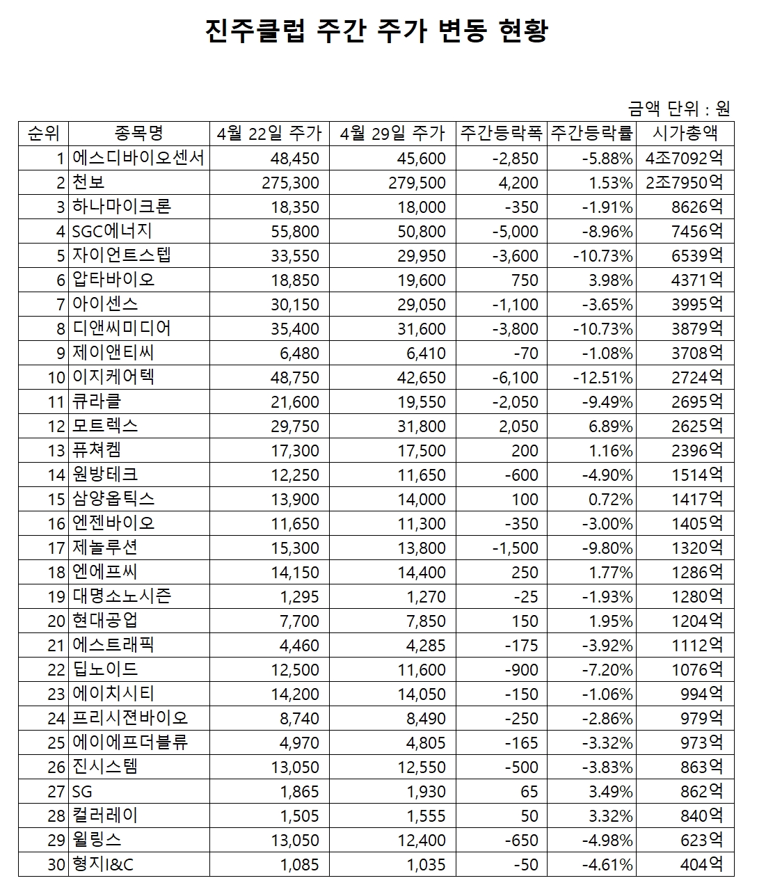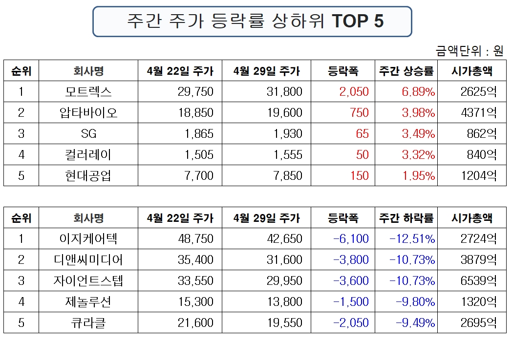 표기순서는 순위, 종목명, 29일 종가, 주간 등락폭, 주간 등락률 순이다.