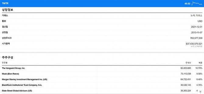 트위터의 지분 분포는 지난달 29일을 기준으로 인덱스 펀드 운영회사인 뱅가드 그룹(Vanguard Group)이 지분 10.79%를 보유하고 있는 최대주주입니다.