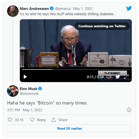 심지어 가상화폐를 적극 지지하는 ‘혁신의 아이콘’ 일론 머스크 테슬라 CEO도 이 문제에 가세했다. 그는 벤처캐피털 투자가 마크 앤드리센이 버핏 회장이 지난달 30일 버크셔해서웨이 주주총회에서 비트코인과 관련해 발언하는 모습이 담긴 영상을 트위터에 올리자 댓글을 달고 “(잘 알지도 못하면서) 비트코인 얘기를 너무 많이 한다”고 조롱했다.