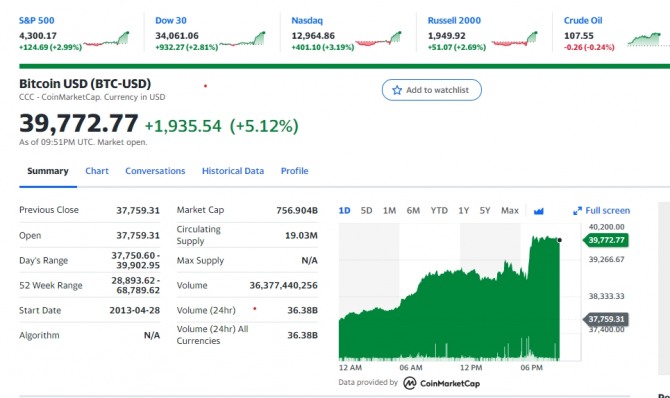 이미지 확대보기5일 뉴욕증시에 따르면 비트코인은 이날 한 때 4만달러르 넘어섰다. 이 시간 현재는 3만9818달러 선으로 4만달러에 거의 육박해 있다. 뉴욕증시에서는 제롬 파월 연방준비제도(Fed·연준) 의장이 더 큰 금리 인상 가능성을 배제하자 비트코인이 4만 달러 수준으로 오른것으로 보고있다.