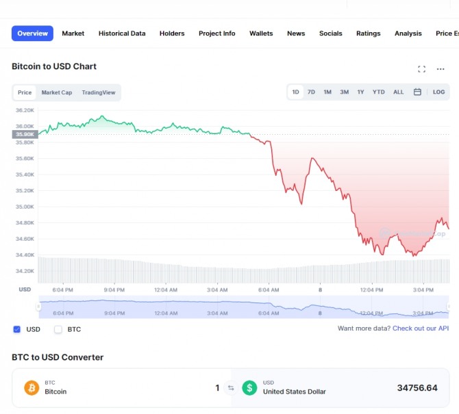 이날 비트코인은 장중 거래에서 최고 3만6129달러를 기록하면서 약간의 모멘텀을 회복했으나 최저 3만4378달러를 기록해 추가 하락을 예고했다.