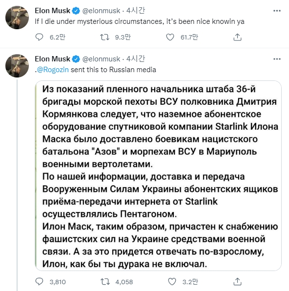 폭스뉴스에 따르면 머스크가 공유한 로고진 전 러시아 부총리의 트윗은 머스크가 러시아에 위성인터넷 서비스 스타링크용 통신장비를 우크라이나에 제공한 것을 맹비난하는 내용이다.
