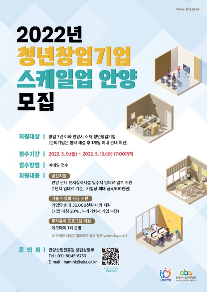 경기도 안양산업진흥원(원장 김흥규)은 역량있는 우수 청년창업기업 발굴과 유치를 위한 '2022 청년창업기업 스케일업 안양'의 참여기업을 모집한다.