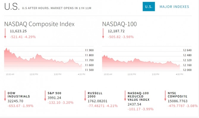 미국 뉴욕증시가 또 다시 급추락했다. 뉴욕증시에 따르면 다우존스30 산업평균지수는 전장보다 653.67포인트(1.99%) 떨어진 32,245.70에 마쳤다. 스탠더드앤드푸어스(S&P) 500 지수는 132.10포인트(3.20%) 하락한 3,991.24에, 또 기술주 중심의 나스닥 지수는 521.41포인트(4.29%) 급락한 11,623.25에 각각 장을 마감했다. S&P 500 지수가 4,000선 아래로 마감한 것은 지난해 3월 31일 이후 1년여 만이다.