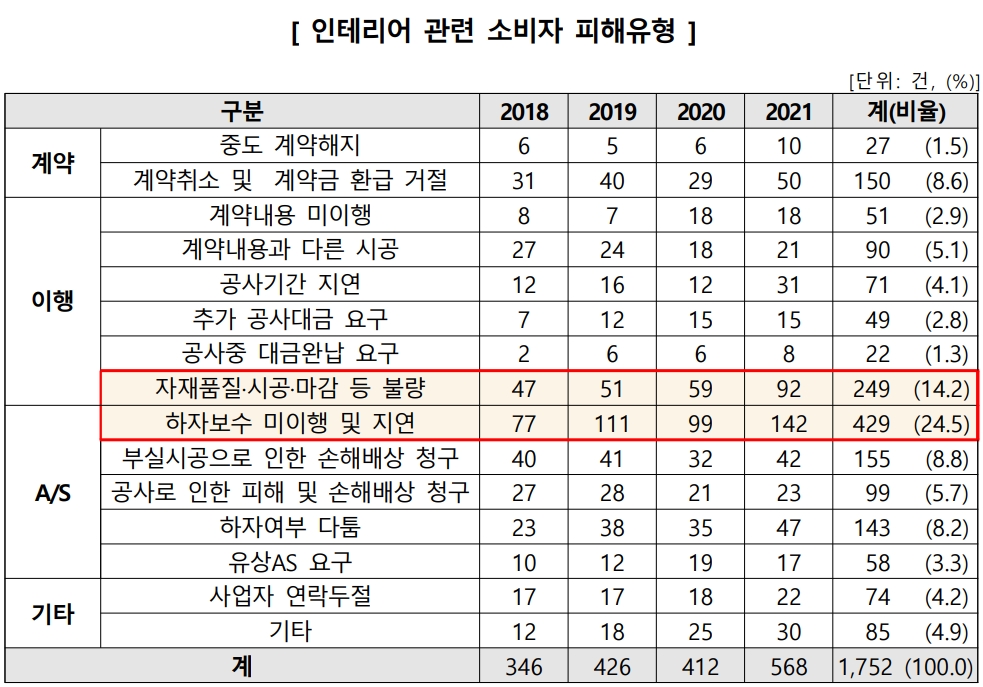 한국소비자원에 따르면 지난 4년(2018∼2021년) 동안 접수된 인테리어 관련 소비자 피해구제 신청 건수는 총 1752건이다. 지난해에는 568건이 접수돼 전년(412건) 대비 37.9% 증가했다.