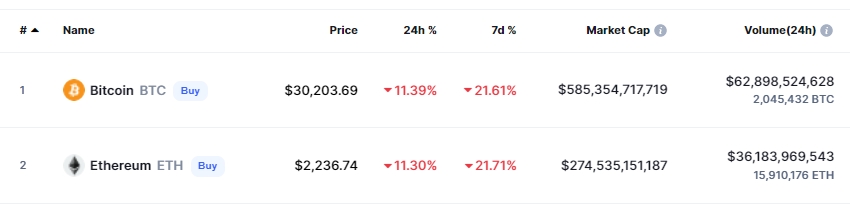 이미지 확대보기한편, 10일(한국시간) 오후 2시 12분 현재 코인마켓캡에서 비트코인(BTC)은 전일 대비 11.39% 폭락해 3만203.69달러를 기록했다. 이는 지난해 11월 최고치였던 약 6만9000달러에 비해 약 56% 하락한 금액이다. 시가총액은 5853억달러가 됐다. 이더리움(ETH) 또한 11.30% 급락해 2236.74달러에 거래됐다.