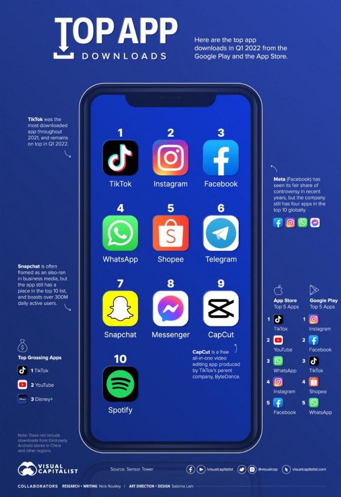 틱톡이 지난 1분기 기록한 다운로드 건수는 센서타워가 지난 2018년 관련 조사를 시작한 이후 최고 기록인 것으로 나타났다. 티톡 다음으로 많이 내려받은 앱은 인스타그램, 페이스북, 왓츠앱, 텔레그램, 전자상거래 플랫폼 쇼피, 스냅챗, 페이스북 메신저 등으로 메타플랫폼스 계열사가 다수를 차지한 것이 이목을 끌었다.