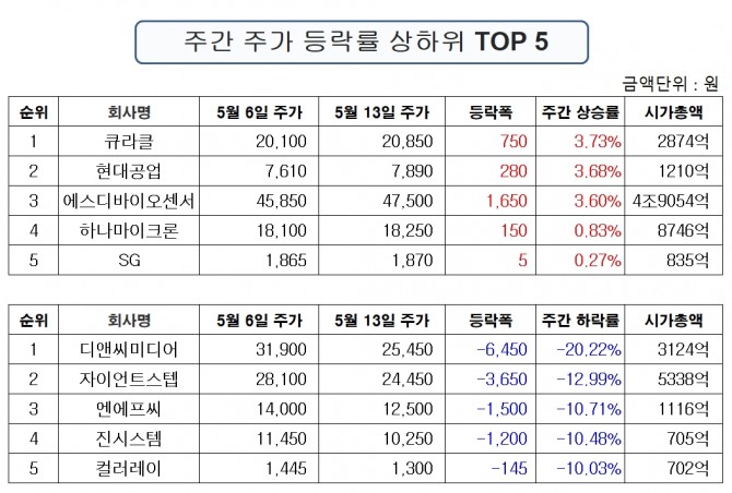 표기순서는 순위, 종목명, 13일 종가, 주간 등락폭, 주간 등락률 순이다.