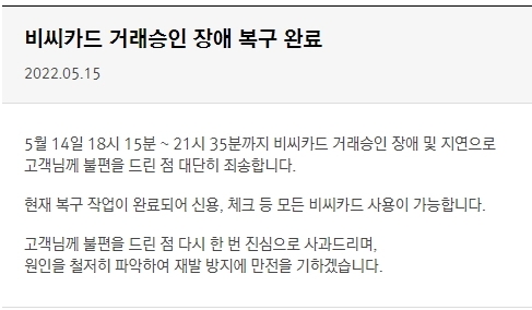 이미지 확대보기15일 BC카드에 따르면 전날 오후 서울 서초동 BC카드 전산센터 정전으로 체크카드 결제에 일시적인 장애가 발생했다.