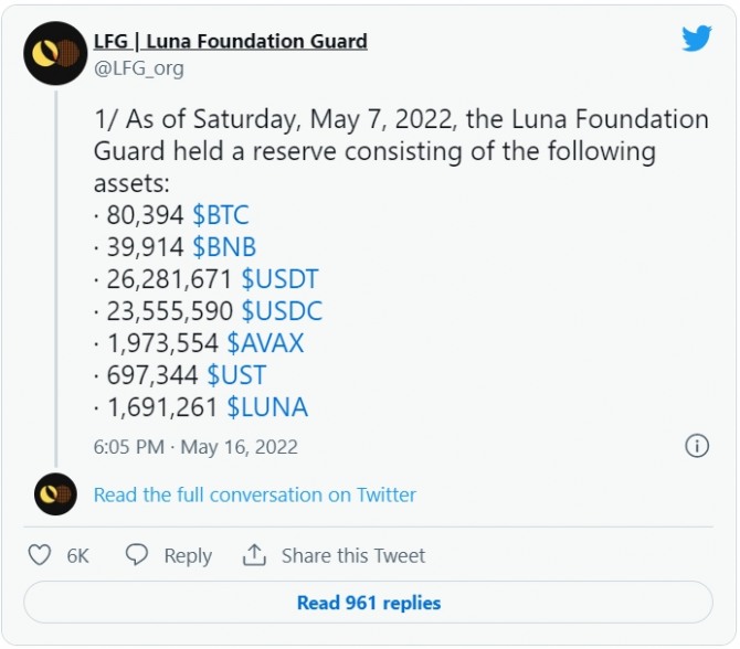 LFG는 이날 트윗에서 지난주 초 테라의 생태계가 붕괴되기 시작하면서 UST를 위해 보유하고 있는 준비금인 BTC의 대부분을 매각했다고 밝혔다.