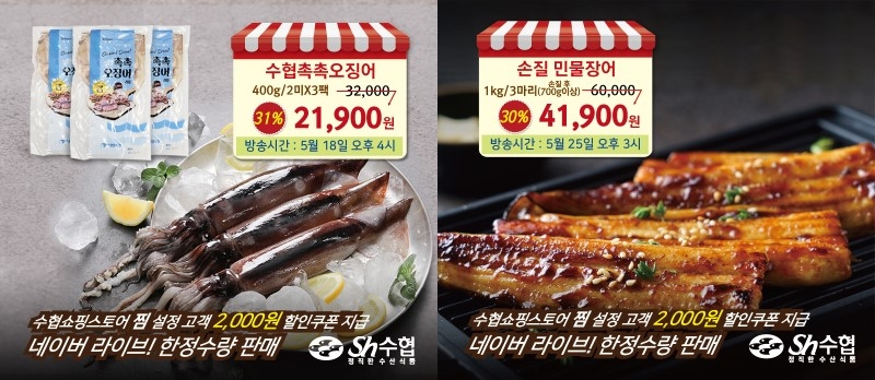 수협은 생방송 중 네이버 쇼핑라이브 수협쇼핑스토어 찜 설정 고객을 대상으로 2000원 할인쿠폰을 제공한다. 상품 구매 고객을 선정해 수산물을 추가 증정하는 이벤트도 진행한다.