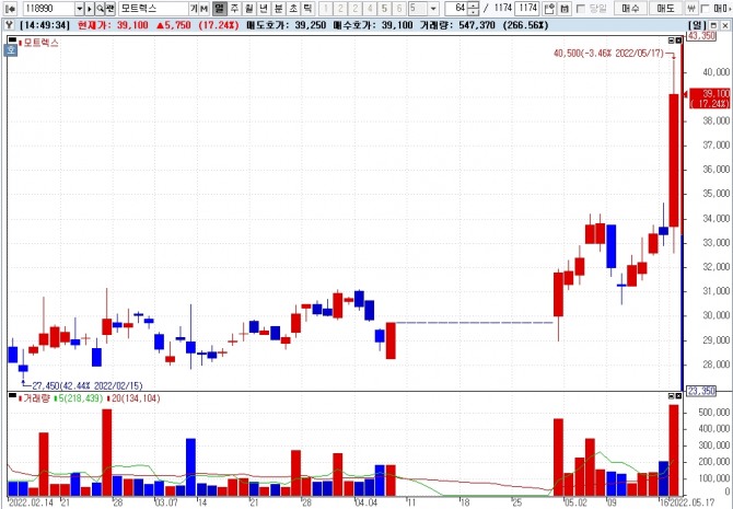 이미지 확대보기17일 한국거래소에 따르면 오후 2시48분 현재 모트렉스 주가는 전거래일 대비 21.44% 상승한 4만500원에 거래되고 있다.
