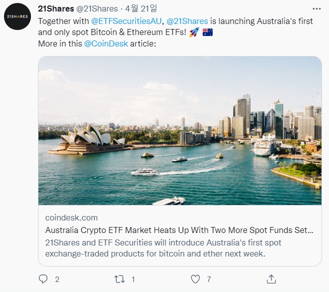 21셰어스는 2018년 SIX 스위스 거래소에 세계 최초의 HODL(암호화폐 거래소 거래 상품)을 구축했다고 밝혔다. 이 회사는 현재 미국 제품을 제외하고 전 세계적으로 30개 이상의 ETP를 제공하고 있다. 21셰어스는 지난 4월 21일 호주에서 비트코인(BTC)과 이더리움(ETH) ETF를 출시했다.