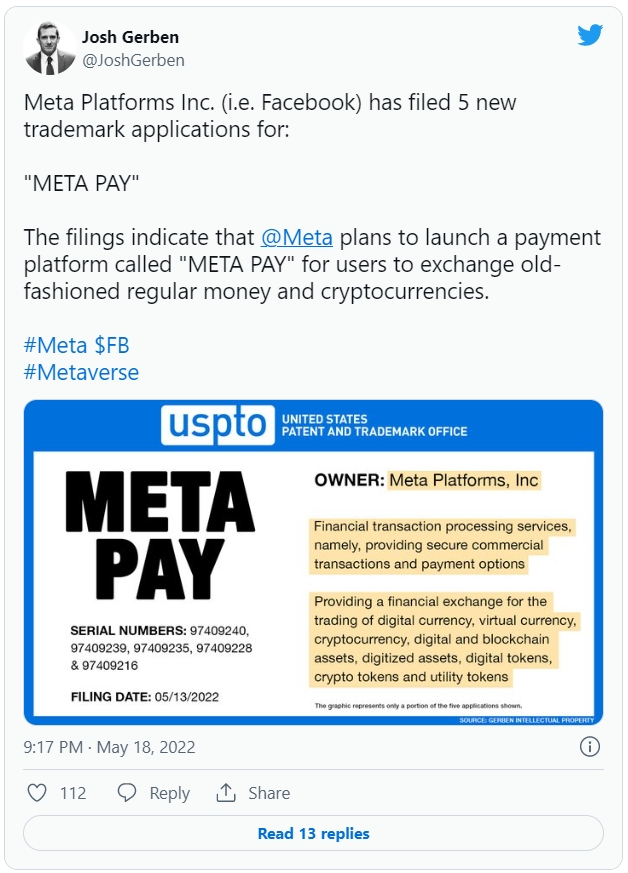 소셜 미디어 거물 메타가 지난 13일 미국 특허상표청(USPTO)에 메타페이 특허 출원을 한 것이 알려지면서 암호화폐 거래 플랫폼 출시를 암시하고 있다. 사진=트위터