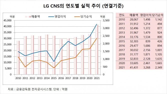 LG CNS는 2021년 연결기준으로 매출액 4조1431억원, 영업이익 3268억원, 당기순이익 2349억원을 기록했습니다. 별도기준으로는 매출액 3조8268억원, 영업이익 2752억원, 당기순이익 2139억원으로 나타났습니다.