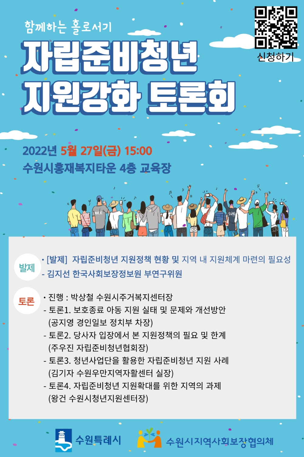 토론회는 유문종 수원시 제2부시장의 인사, ‘자립준비청년 지원정책 현황 및 지역 내 지원체계 마련의 필요성’을 주제로 한 김지선 한국사회보장정보원 부연구위원의 발제와 패널토론, 질의응답으로 진행된다.