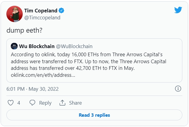 30일 온체인 데이터에 따르면, 싱가포르 기반의 암호화폐 헤지 펀드인 쓰리 애로우 캐피털(Three Arrow Capital)과 관련된 것으로 의심되는 이더리움 주소가 1시간 만에 6000만 달러 상당의 ETH 3만2000개를 FTX 암호화폐 거래소에 보냈다.