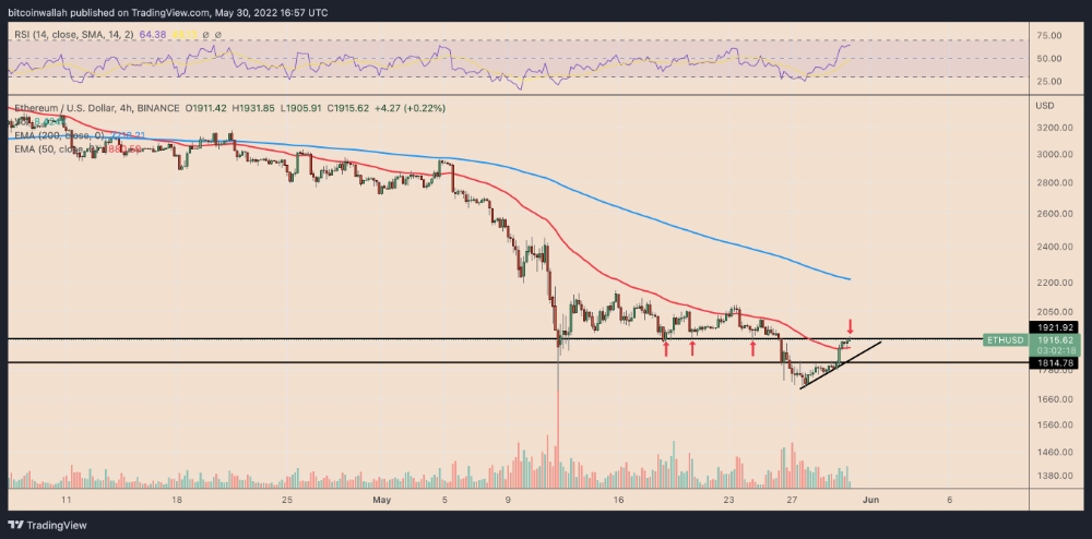 쓰리 애로우의 FTX로의 대규모 ETH 전송은 아래와 같이 ETH가 돌파를 위해 1920달러 근처의 중요한 지지에서 저항 수준을 테스트하는 것과 일치한다.