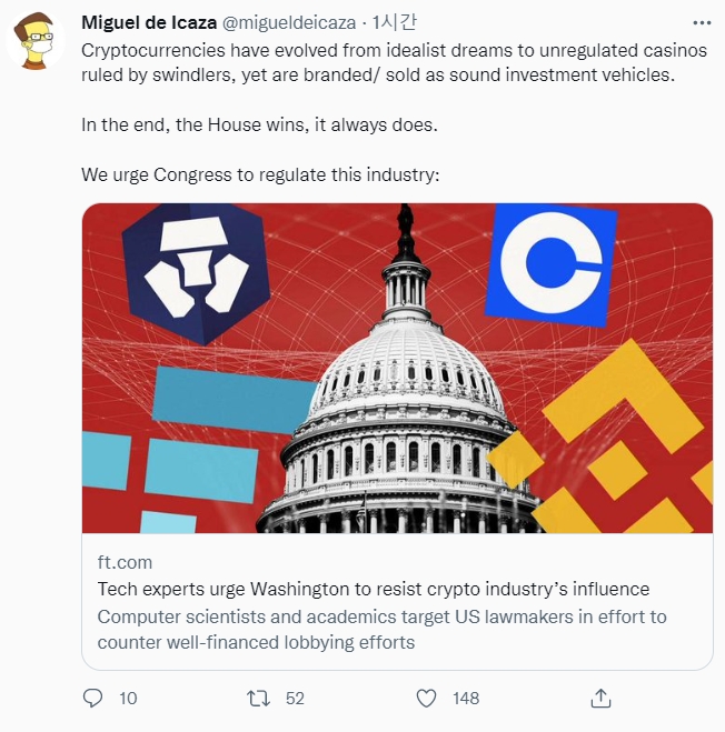 이들은 서신에서 "우리는 위험하고 결함이 있으며 입증되지 않은 디지털 금융 상품에 대한 규제 안전 피난처를 만들기 위해 디지털 자산 산업 금융가, 로비스트 및 부스터의 압력에 저항할 것을 촉구한다"고 주장했다.