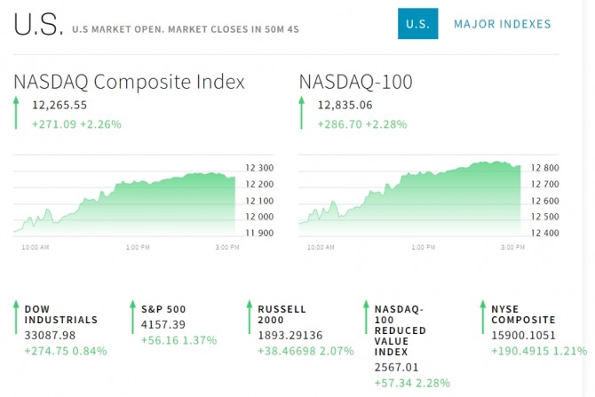 뉴욕증시는 민간 고용이 부진하게 나온 데다 마이크로소프트가 분기 실적 전망치를 하향했다는 소식에 하락 출발했으나 .OPEC+ 증산 합의 소식에 급등세로 바뀌었다, 뉴욕증권거래소(NYSE)에서 다우존스30산업평균지수와 스탠더드앤드푸어스(S&P)500지수 그리고 기술주 중심의 나스닥 지수 모두 오르고 있다.