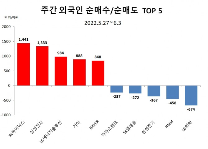 5일 한국거래소에 따르면 유가증권시장에서 외국인투자자들은 지난달 30일부터 이달 3일까지 한주간 SK하이닉스 주식을 1441억원 순매수하고, 삼성전자는 1333억원 사들였다.