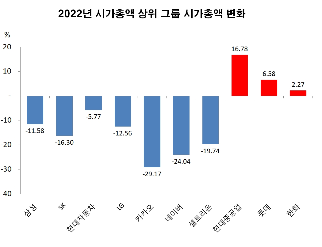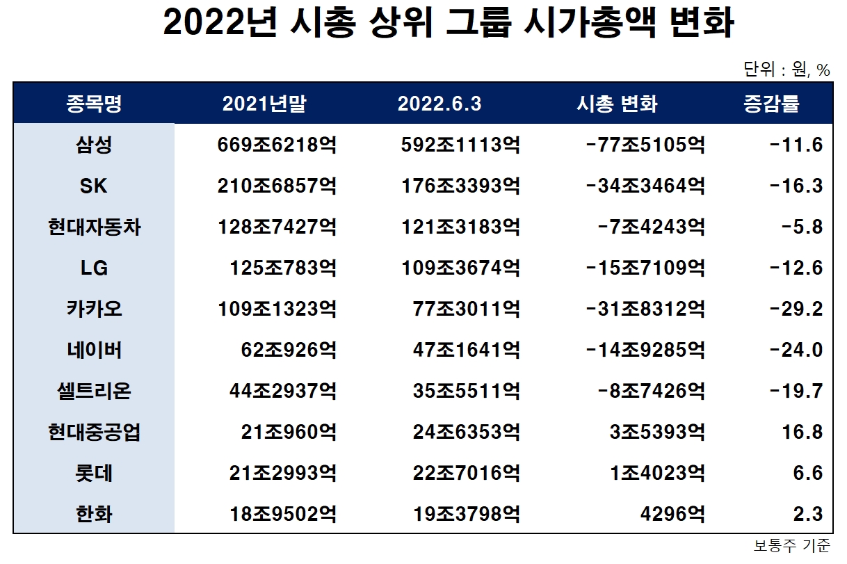 시총 상위 10대 그룹 중 카카오그룹과 네이버 셀트리온 등 그룹 사업 포트폴리오가 인터넷과 바이오에 편중된 기업들의 시가총액 감소가 두드러졌다.