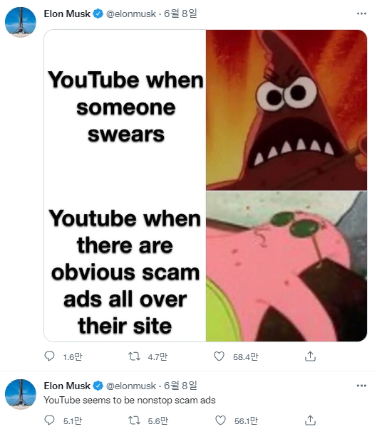 머스크가 비록 짧은 트윗이었지만 허위광고나 사기성광고를 비롯한 유튜브의 문제를 지적하고 나서자 트위터에 이어 유튜브 인수에 나선 것 아니냐는 성급한 관측까지 불러일으키고 있다.