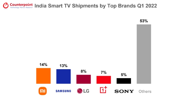 시장조사업체인 카운터포인트리서치에 따르면 인도 스마트 TV 올해 1분기 시장 점유율에서 샤오미가 14.3%로 1위이며 삼성전자가 13.1%로 2위다. 이어 LG전자가 8%, 원플러스가 7%, 소니가 5%다.