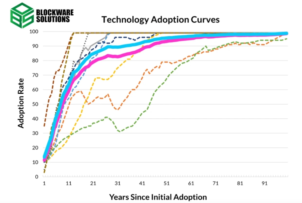 블록웨어 인텔리전스(Blockware Intelligence)는 지난 8일 공개한 보고서에서 자동차, 전력, 스마트폰, 인터넷, 소셜 미디어를 포함한 과거 9개의 파괴적인 기술에 대한 역사적 채택 곡선과 2009년 이후 비트코인 ​​채택 성장률을 조사하여 이러한 예측에 도달했다고 밝혔다.
