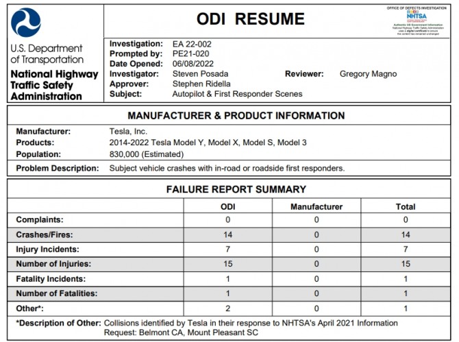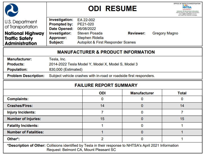 NHTSA는 예비조사에 착수하면서 “지난 2018년 1월 이후 11건의 테슬라 전기차 관련 충돌 사고가 발생한 것이 확인했으며, 특히 테슬라가 응급 차량과 충돌한 뒤에 사고를 일으킨 사실을 확인했기에 조사에 나선다”고 밝힌 바 있다.