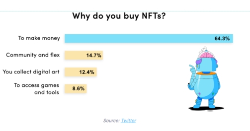 12일(이하 현지시간) 비트코이니스트에 따르면 NFT 전문 사이트 덱스터랩이 지난 10일 전세계 NFT 거래자 1318명을 대상으로 설문조사를 벌인 결과 응답자의 64.3%가 ‘수익 창출을 위해’ NFT를 거래한다고 밝혔다.